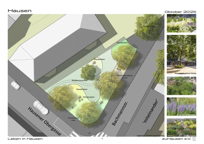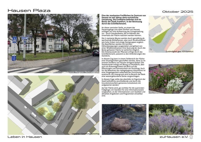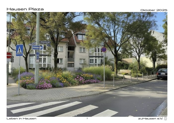 Die leider etwas lieblos gestaltete Grünfläche unmittelbar vor dem Gelände der Brotfabrik ist öfentliches Grün. In Abstimmung mit dem Grünflächenamt und dem OBR schlägt zuHausen eine Umgestaltung vor. Die ambitionierte Gesamtgestaltung ist wohl unerreichbar – der OBR hat aber das Grünflöchenamt beauftragt, zeitnah eine gestalterische Verbesserung durch Setzen eines Staudenbeets, Baumneusetzung und Platzieren einer Sitzbank für die ältere Bevölkerung vorzunehmen.